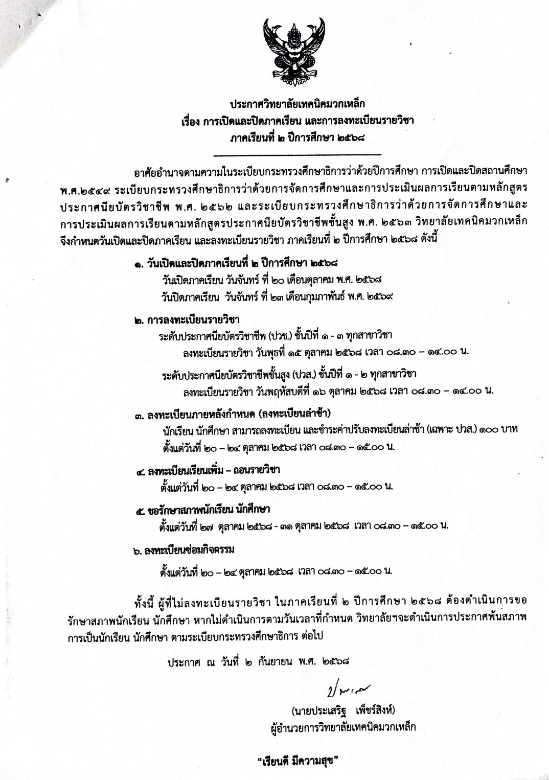 ประกาศฯ เรื่องการเปิดและปิดภาคเรียน และการลงทะเบียนรายวิชา ภาคเรียนที่ 2 ปีการศึกษา 2568