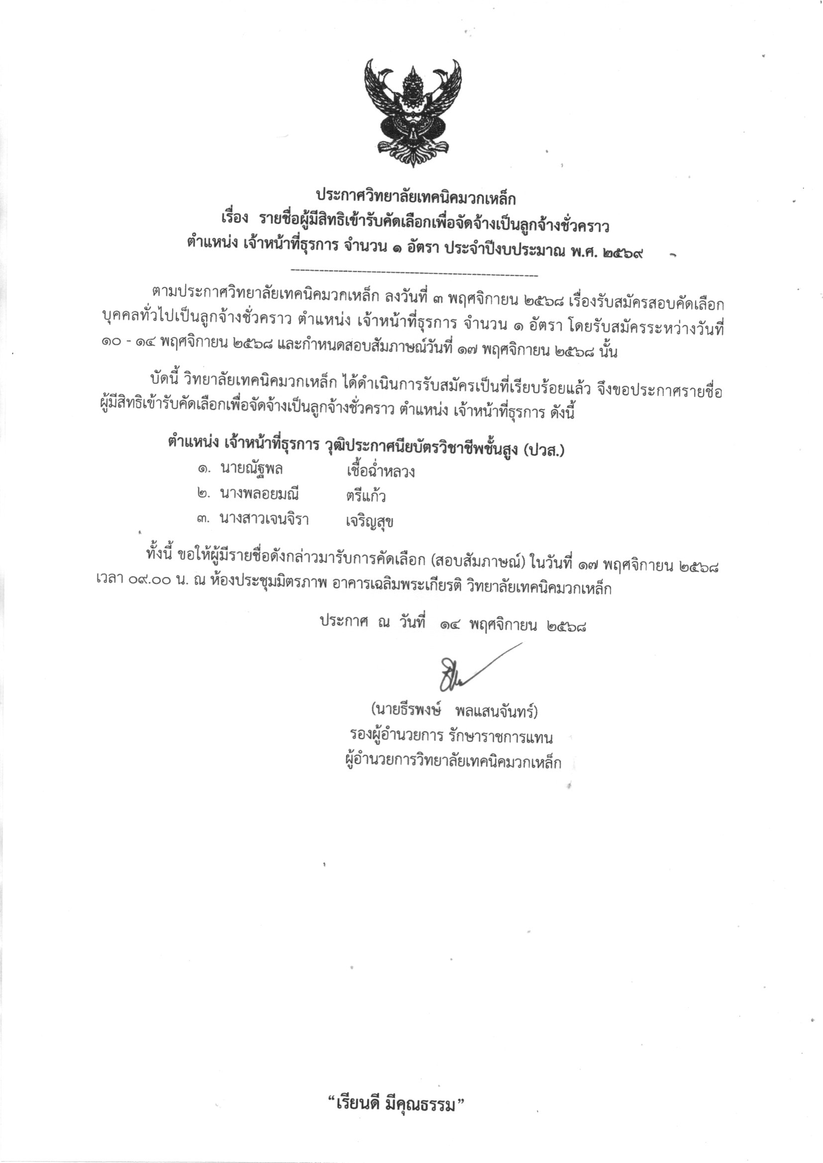 ประกาศรายชื่อผู้มีสิทธิเข้ารับคัดเลือกเพื่อจัดจ้างเป็นลูกจ้างชั่วคราว ตำแหน่ง เจ้าหน้าที่ธุรการ