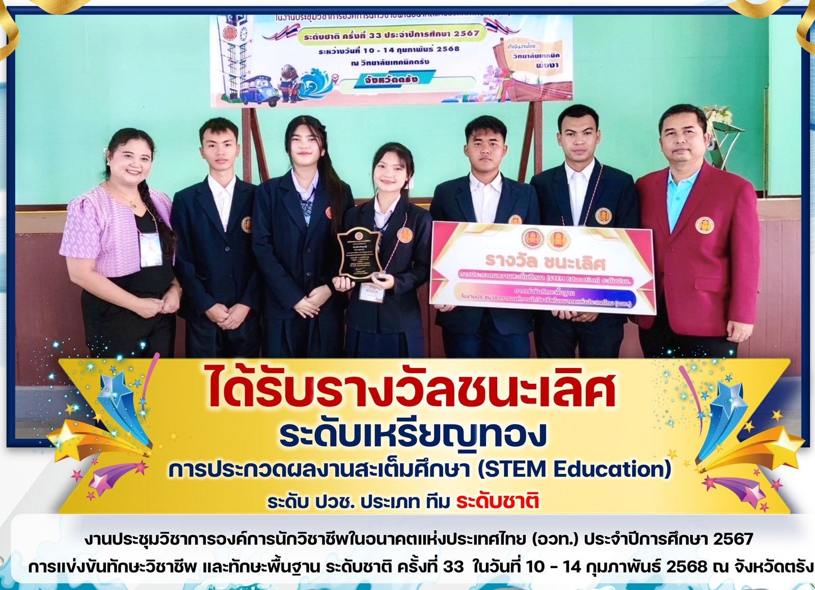 ชื่อผลงาน : รางวัลชนะเลิศ ระดับเหรียญทอง ระดับชาติ การประกวดผลงานสะเต็มศึกษา (STEM Education) ระดับ ปวช. ประเภท ทีม ประจำปีการศึกษา2567